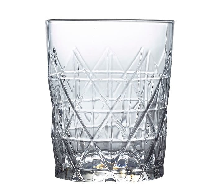 Keops glass tumbler, 12.1oz / 34.5cl – stunning triangular patterned glass tumbler. Vintage diamond cut design casts intricate light reflections on nearby surfaces