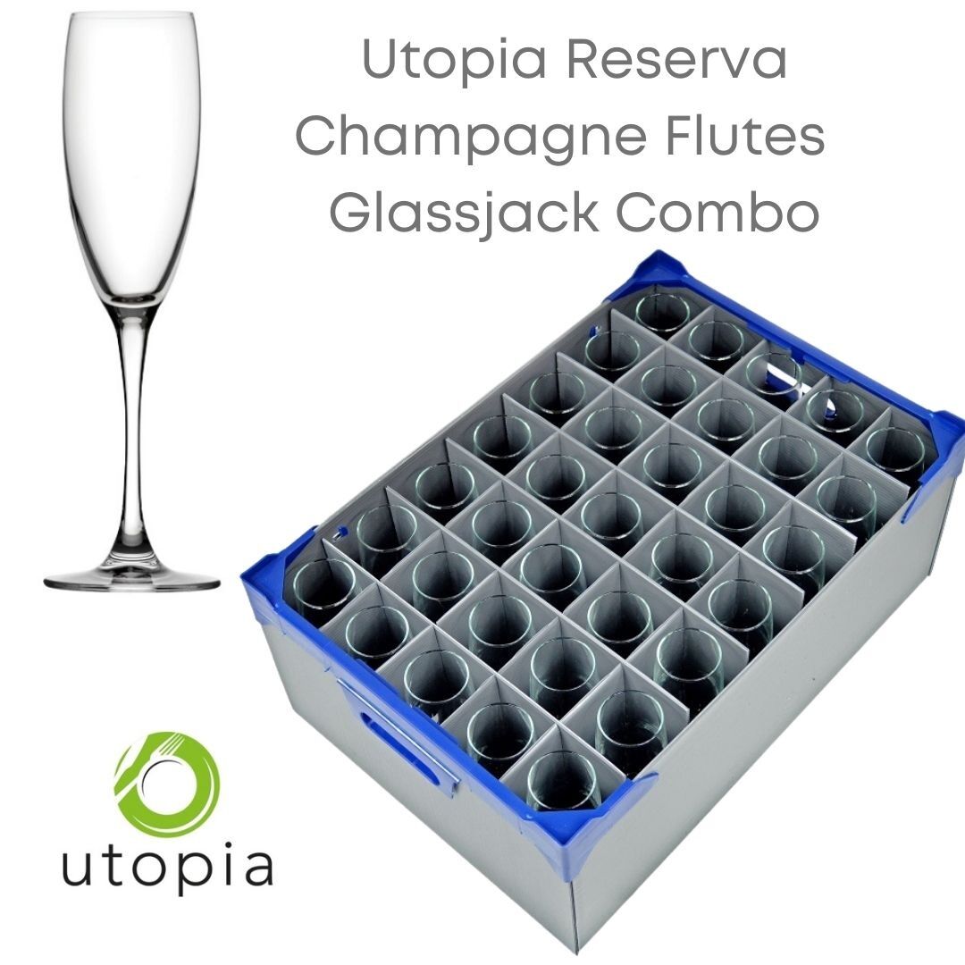 Pack of 35 Reserva Champagne Flutes 5.6oz (16cl) by Utopia and glassware storage crate.